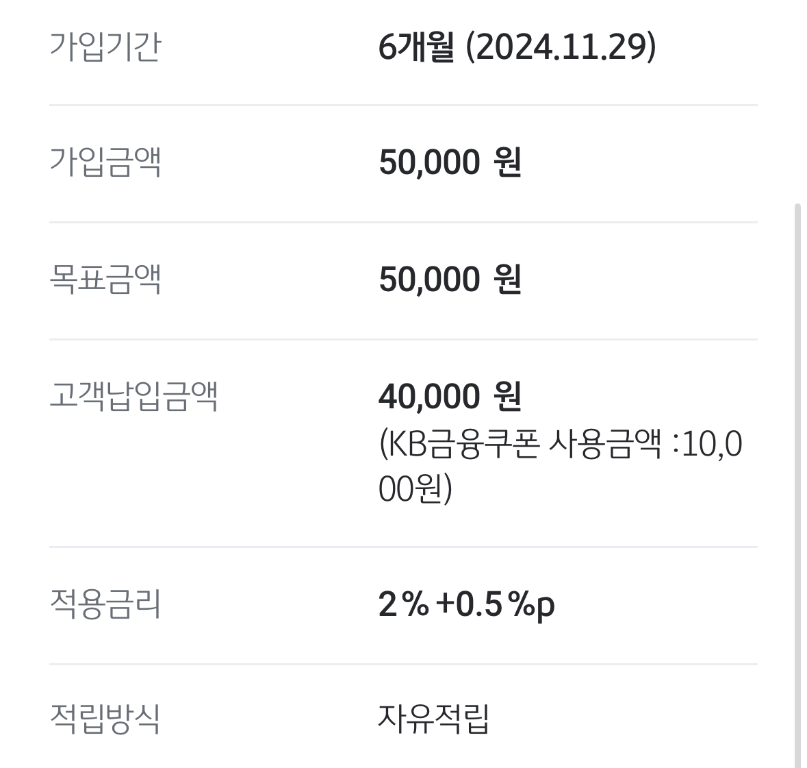 목표금액 달성하면 우대금리 준다고 하길래 5만 원으로 하고 우대금리 받았고요. 적립 방식은 자유적립으로 했어요. 생각날 때 최소 납입 금액으로 한 달에 한 번씩만 넣으면 될 것 같습니다.