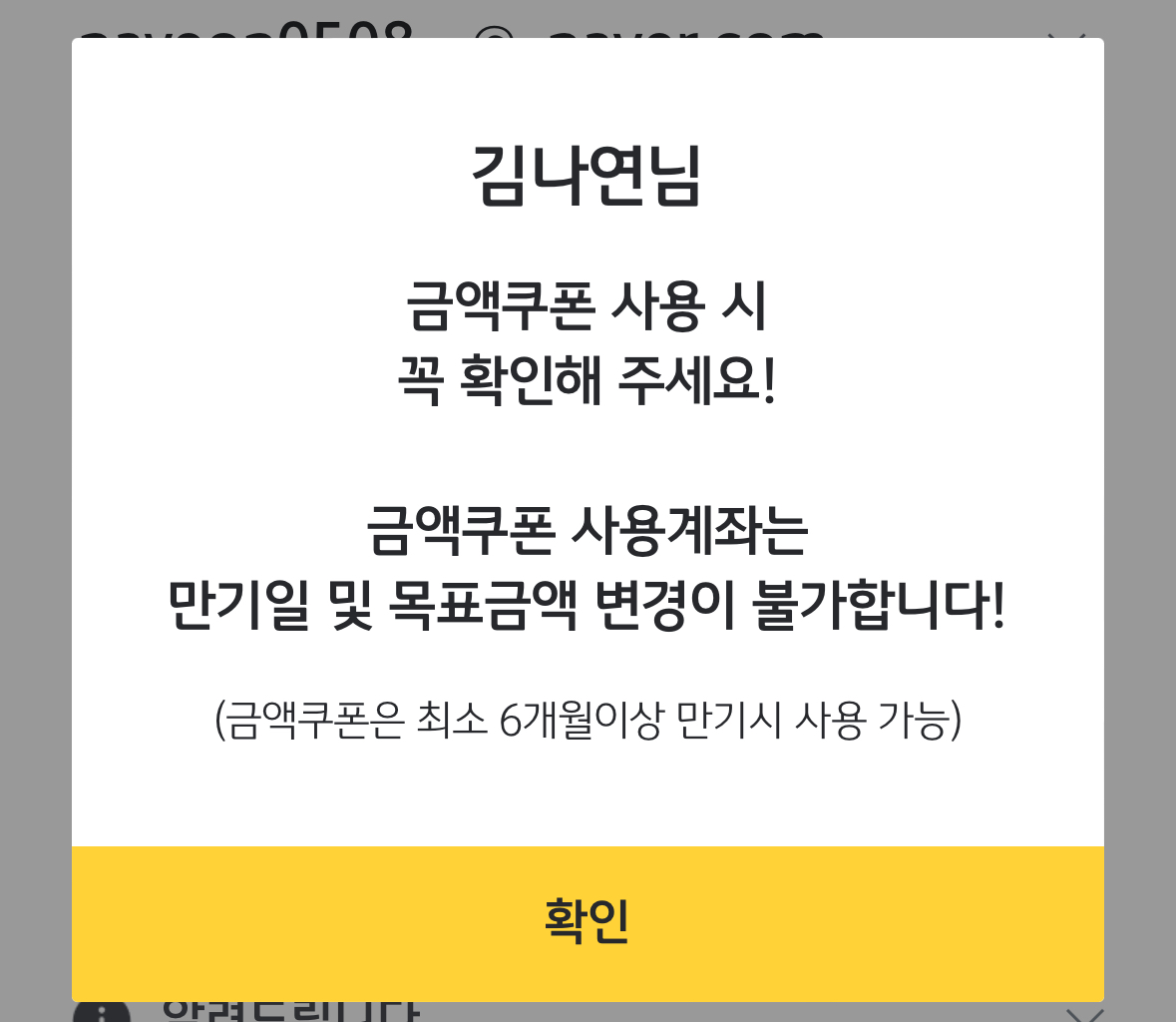금액쿠폰 사용계좌는 만기일 및 목표금액 변경이 불가하고, 금액쿠폰은 최소 6개월 이상 만기에만 사용 가능합니다.