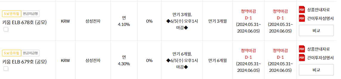 확실히 지난 ELB보다 쿠폰이 낮아진 느낌입니다. 1년 연 5%가 크긴 했어요. 만기 6개월은 연 4.3%이고요. 만기 3개월은 연 4.1%입니다. 오후 1시 전에 100만 원 이상 청약하는 것 잊지 마세요! ELB 금융상품이 어떤 느낌인지 궁금하다면 3개월 상품으로 경험해 보는 것도 추천합니다.