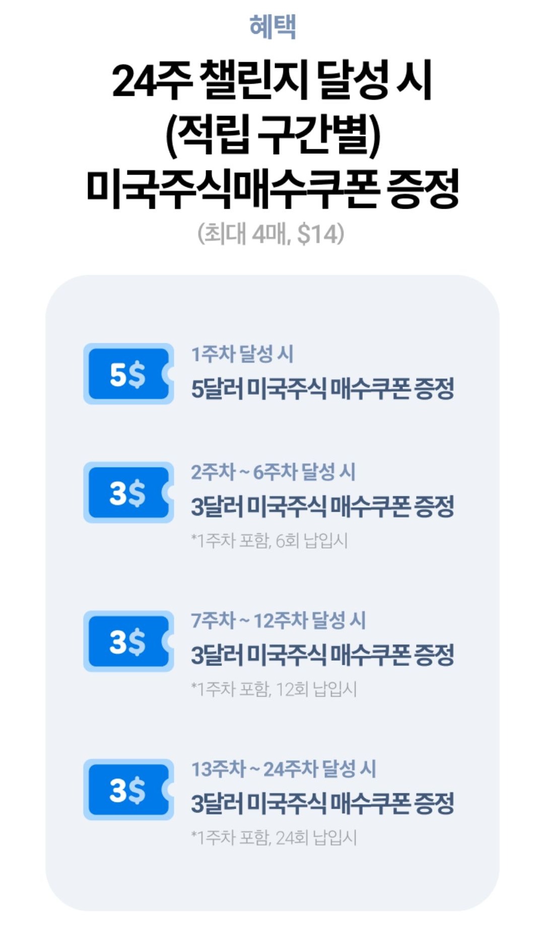 혜택 : 챌린지 기간 동안 주간 적립 달성 시 미국 주식 매수쿠폰 증정 (최대 4매 증정)