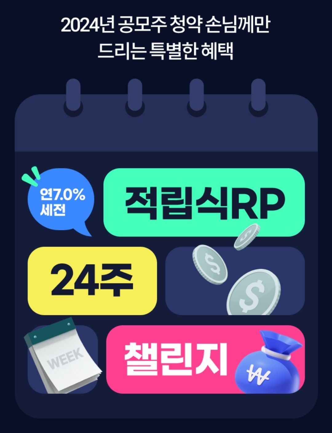 하나증권에서 24년 공모주 청약 고객만 가입할 수 있는 적립식 RP 24주 챌린지 금융상품이 있습니다. 올해 아직 하나증권에서 공모주 청약하지 않았더라도 이벤트 기간 안에 청약하면 24주 챌린지 참여할 수 있는 듯 하니까 참고해 주세요. 무려 연 7% RP 특판이라는 사실!! 근데 납입 금액이 적어서 이자는 많지 않습니다...!