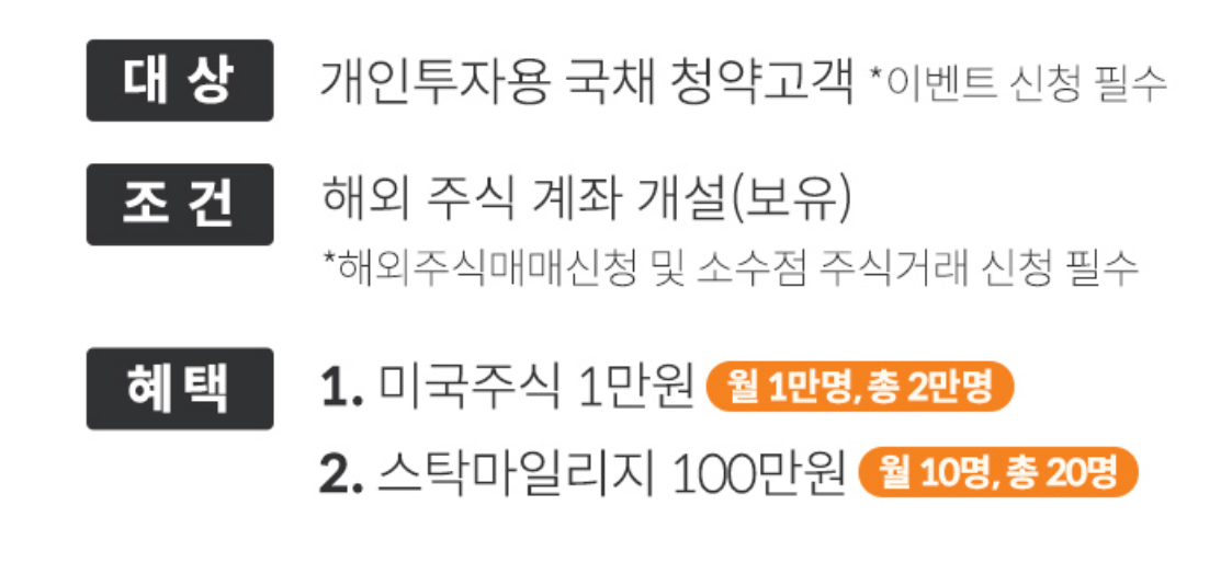 현재 미래에셋증권에서 개인투자용 국채 청약 고객 대상으로 이벤트도 하고 있습니다. 청약만 해도 추첨을 통해 해외주식 거래할 수 있는 금액 제공은 최소 청약 금액 없습니다. 그 외 청약 금액 구간별 이벤트는 최소 1천만 원 이상이네요.
