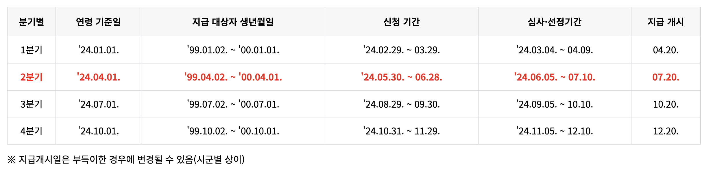 2분기 지급은 7월 20일부터입니다. 3분기 신청기가은 8월 29일부터입니다. 지급 대상자 생년월일은 미리 체크하세요.