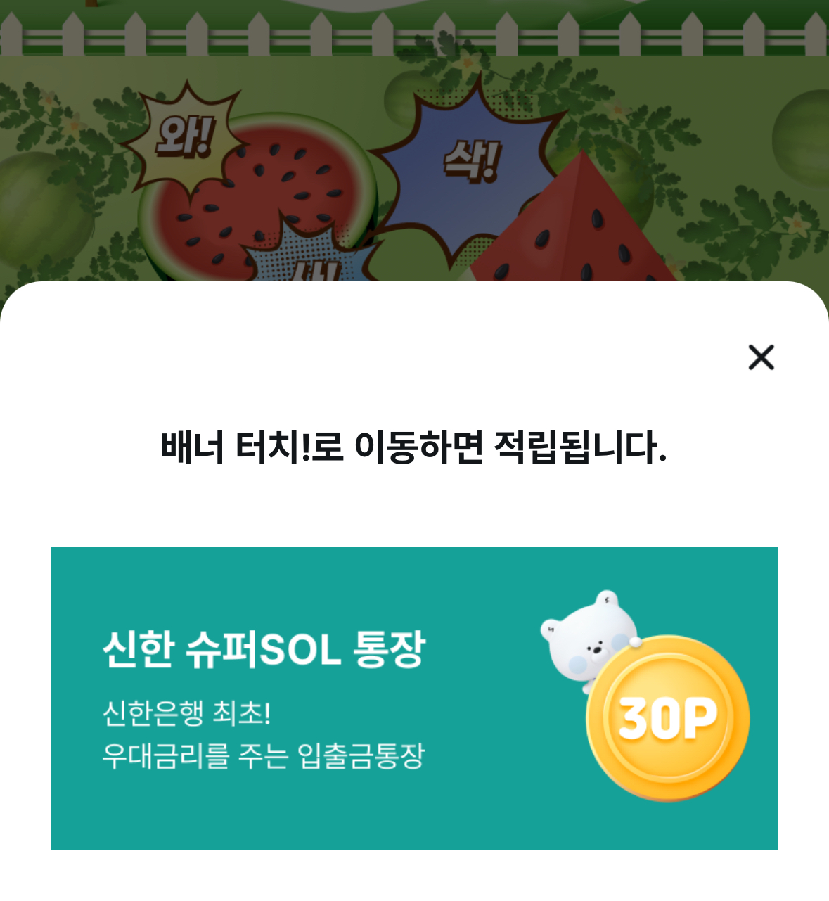배너 터치해서 이동해야 적립됩니다. 한 번만 누르고 다시 뒤로가기 해서 다른 수박 열어보세요.