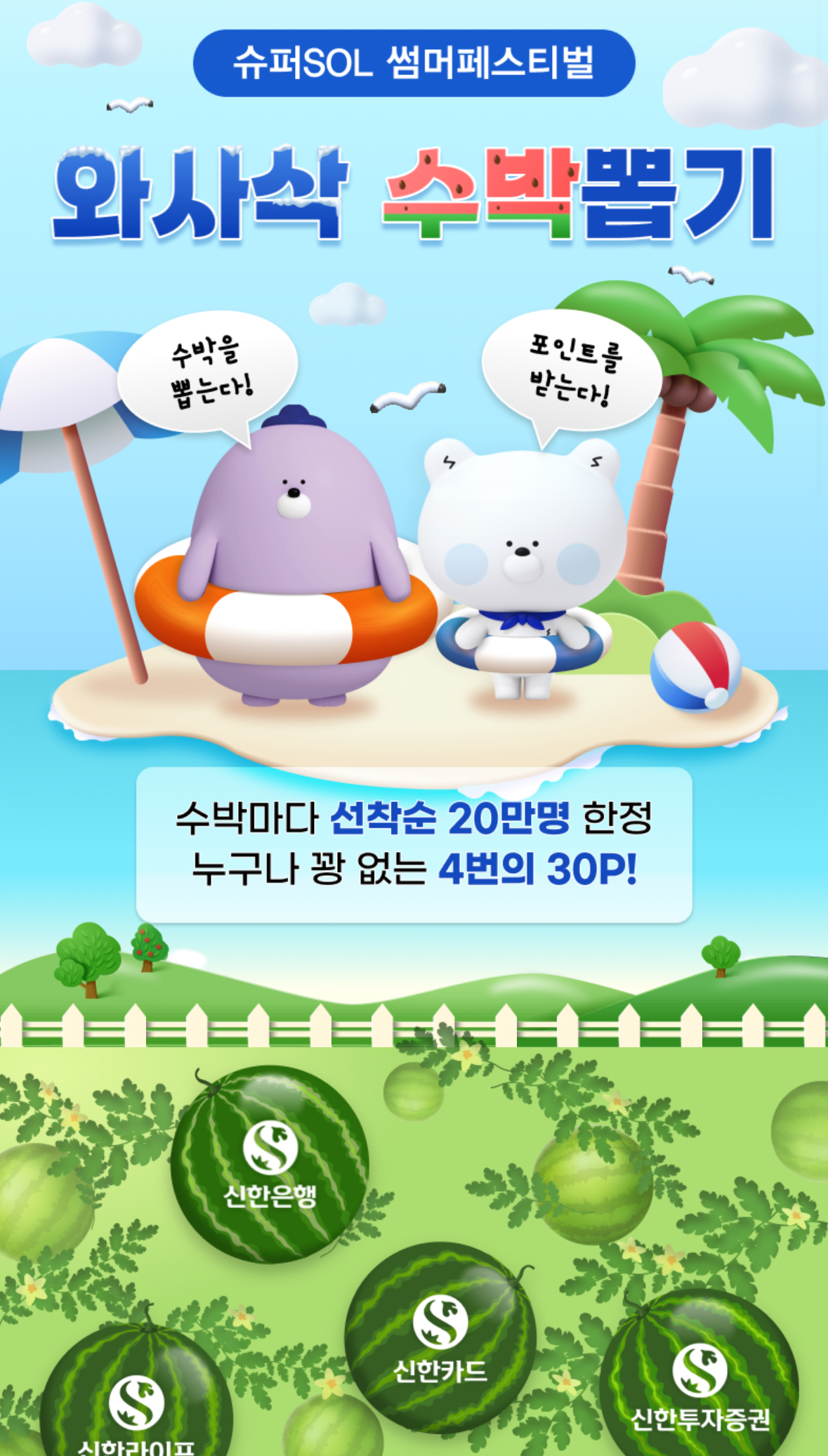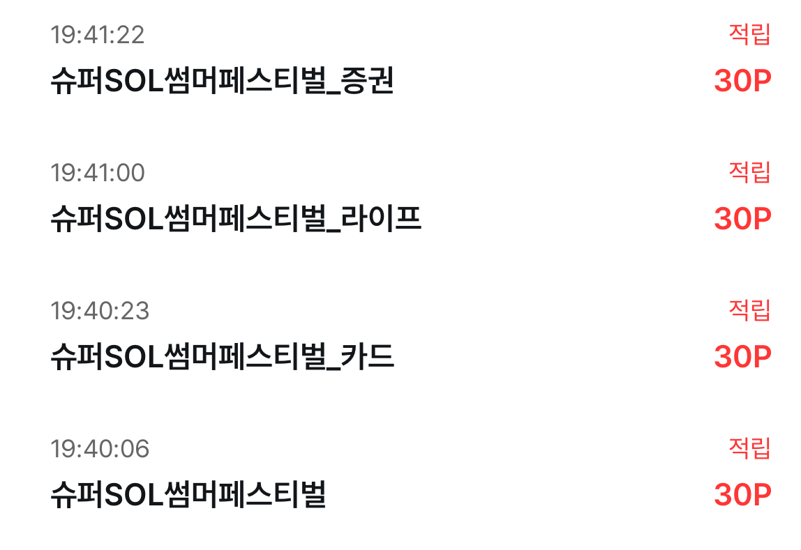 신한 슈퍼SOL 앱에서 썸머페스티벌 이벤트 진행하고 있습니다. 클릭만 해도 총 120점 받을 수 있는 꿀 이벤트입니다. 슈퍼SOL 썸머페스티벌 이벤트는 팝업창 2번째 있어요. 배너 누르면 이벤트로 이동합니다.