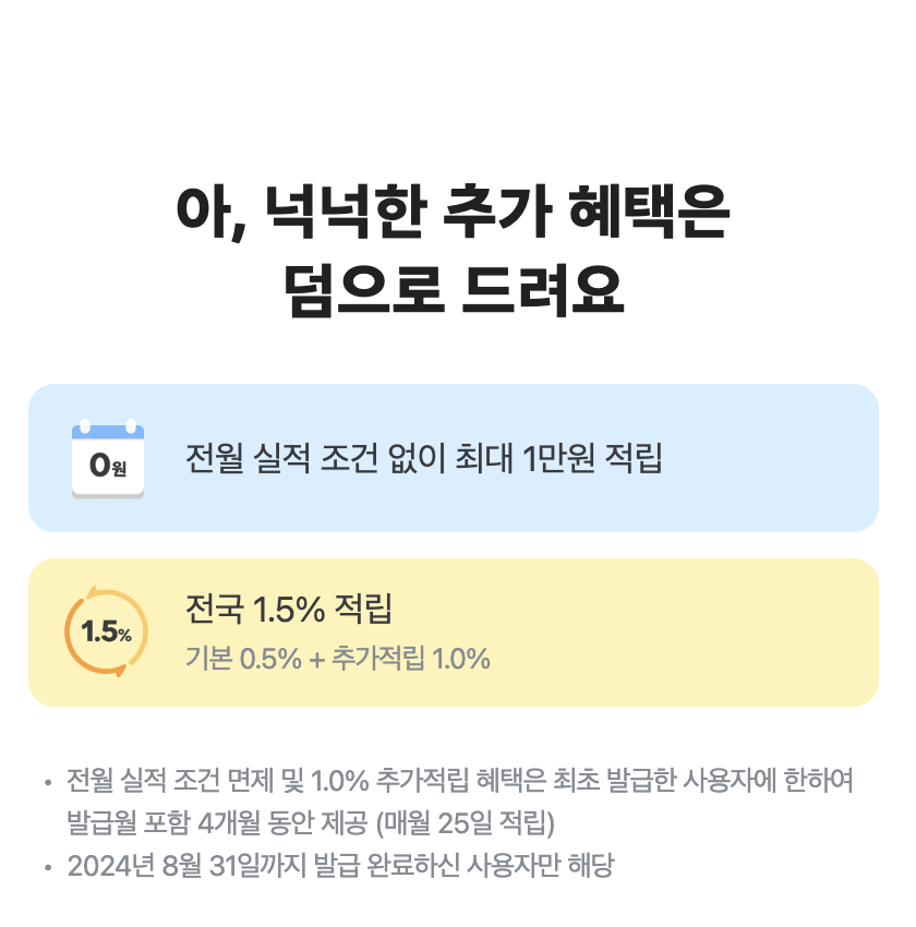 런칭 이벤트로 8월 31일까지 발급 완료한 사용자는 전월 실적 조건 면제 및 1% 추가 적립받을 수 있고요. 발급월 포함 4개월 동안 제공합니다. 제공되는 머니는 매월 25일에 적립되고요. 발급받으려면 빠르게 신청해서 혜택 쏙쏙 빼먹어도 좋겠습니다.