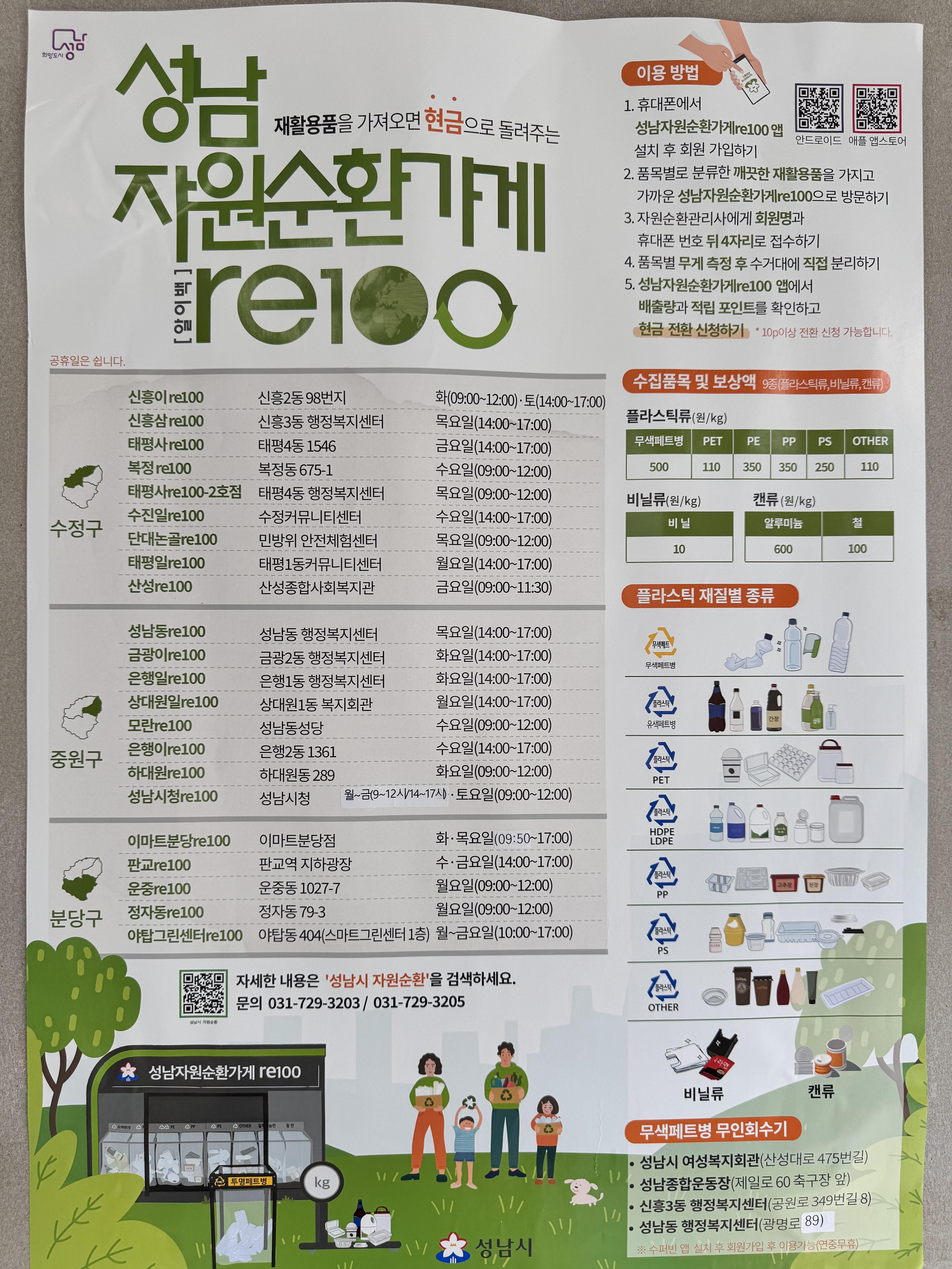 성남 자원순환가게 re100에서 수집하는 품목입니다. 병마개는 꼭 같이 있어야 된다고 합니다. 처음 참여하는 분들은 무조건 방문하지 마시고, 일단 앱 "성남자원순환가게re100" 다운로드 후 회원가입하세요. 재활용품은 깨끗하게 씻어서 가까운 성남 자원순환가게re100으로 방문하고요. 자원순환관리사에게 회원명과 휴대폰 번호 뒤 4자리로 접수합니다. 품목별 무게 측정 후 수거대에서 직접 분리합니다. 앱에서 배출량과 적립포인트 확인하면 끝입니다.
