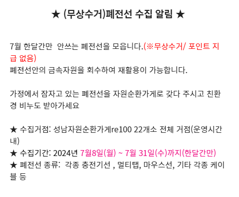7월 한 달동안 안 쓰는 폐전선도 무상수거합니다. 포인트 지급 없고요. 폐전선 종류는 각종 충전기선, 멀티탭, 마우스선, 기타 각종 케이블 등이 대상입니다. 망가져서 그냥 쓰레기통에 버리지 말고 재활용에 기부해요~~