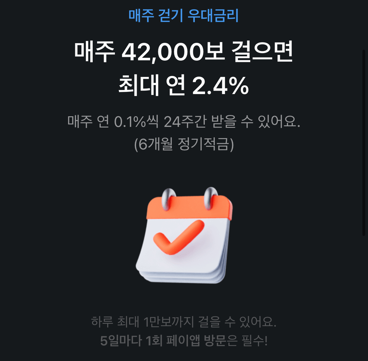 - 매주 7일 누적 42,000보 달성시 매주 연 0.1% 금리 지급