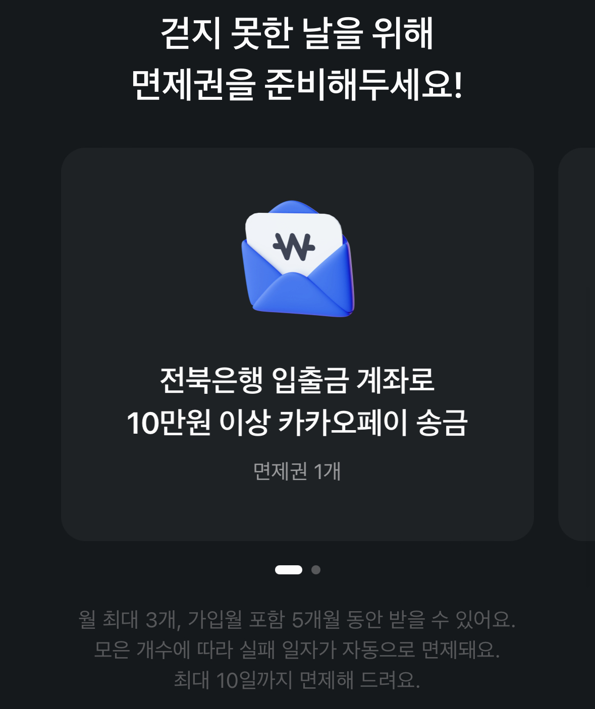 1) 카카오페이 송금 : 카카오페이 > 전북은행 원화 입출금계좌에 1회, 10만 원 이상 송금시 1장 발행