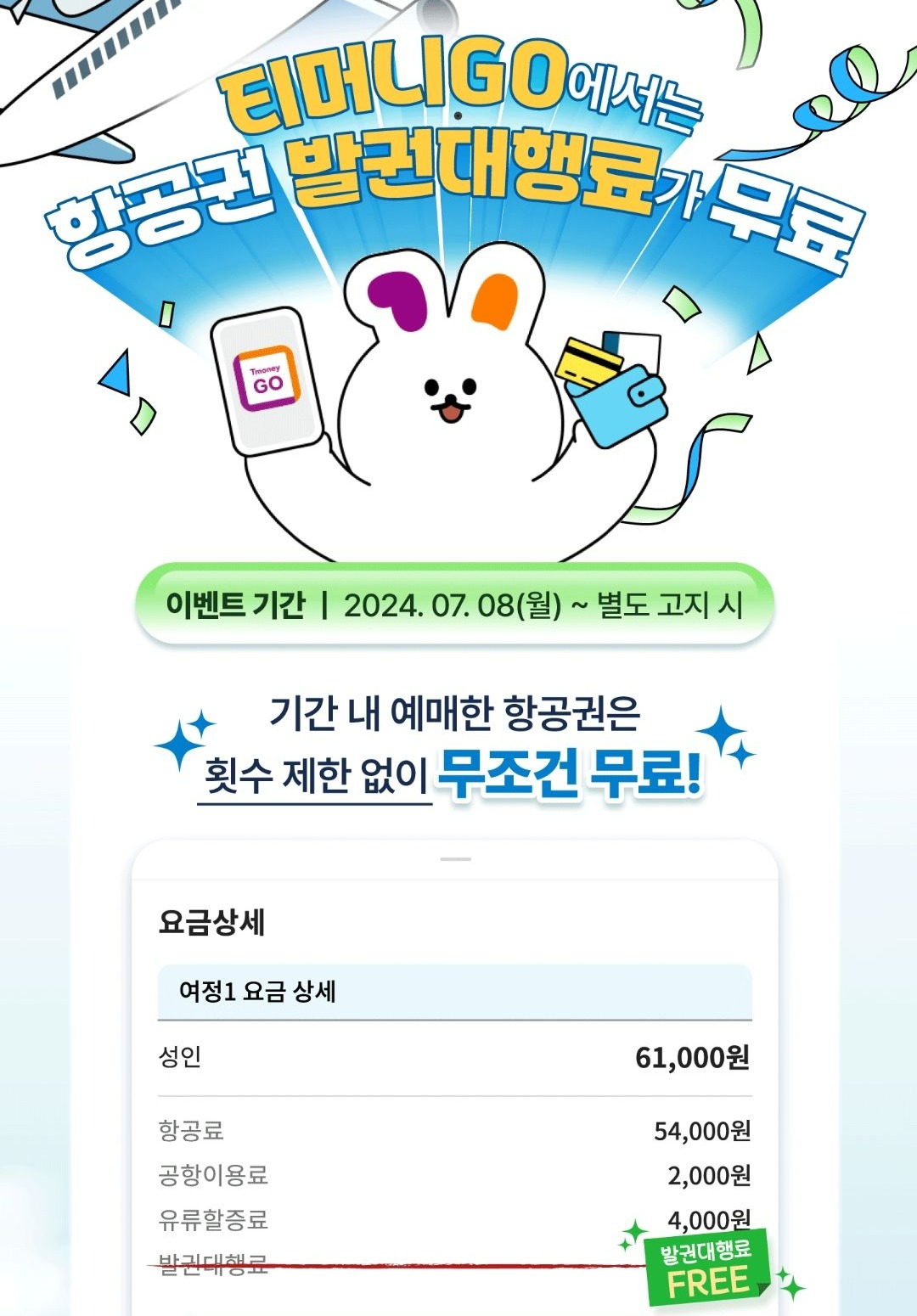 티머니고 앱에서 항공권 예매하면 횟수 제한 없이 발권대행료가 무료입니다. 금액은 소소할 수 있어도 받으면 좋으니까요!