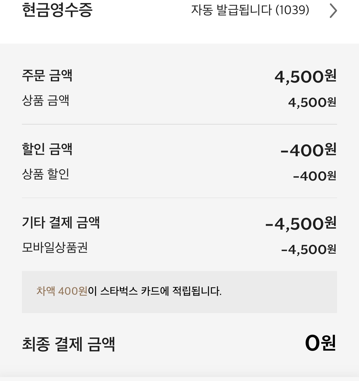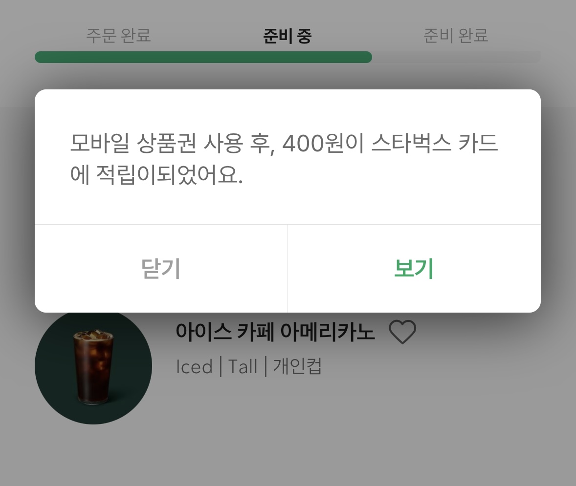 스타벅스 앱에서 주문할 때 차액 400원이 스타벅스 카드로 적립된다고 적혀있어요. 앞으로 기프티콘 사용해서 0원일 때도 개인컵 지참해야겠습니다.