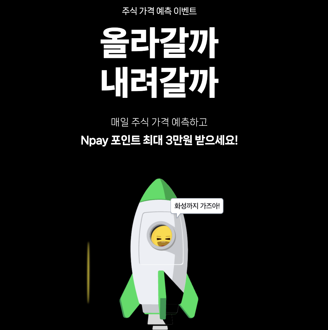 매일 주식 가격 예측하면 네이버 포인트를 최대 3만 원 받을 수 있습니다. 네이버페이앱에서 이벤트 참여하면 2배 적립되니까 하단 링크 들어가서 오늘부터 오른다 / 내린다 투표만 한 번 하세요. 손해 0원, 오히려 안 하면 손해인 이벤트입니다.
