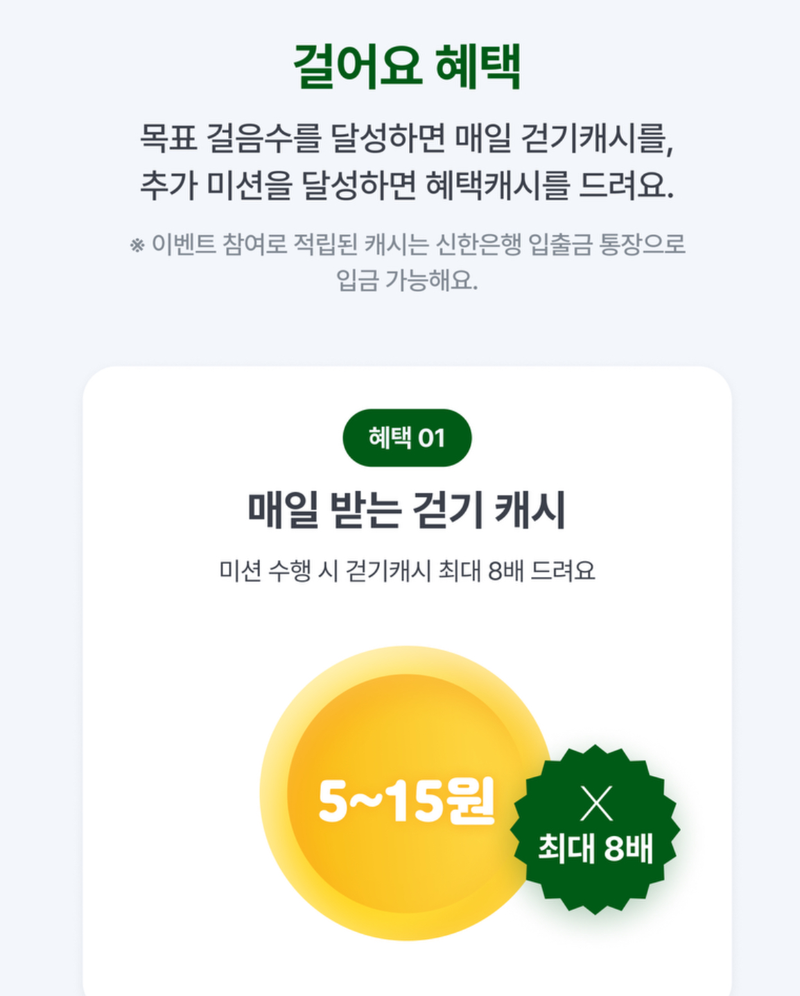 매일 미션 + 추가 미션으로 5~15원에서 미션 수행하면 최대 8배 지급합니다.