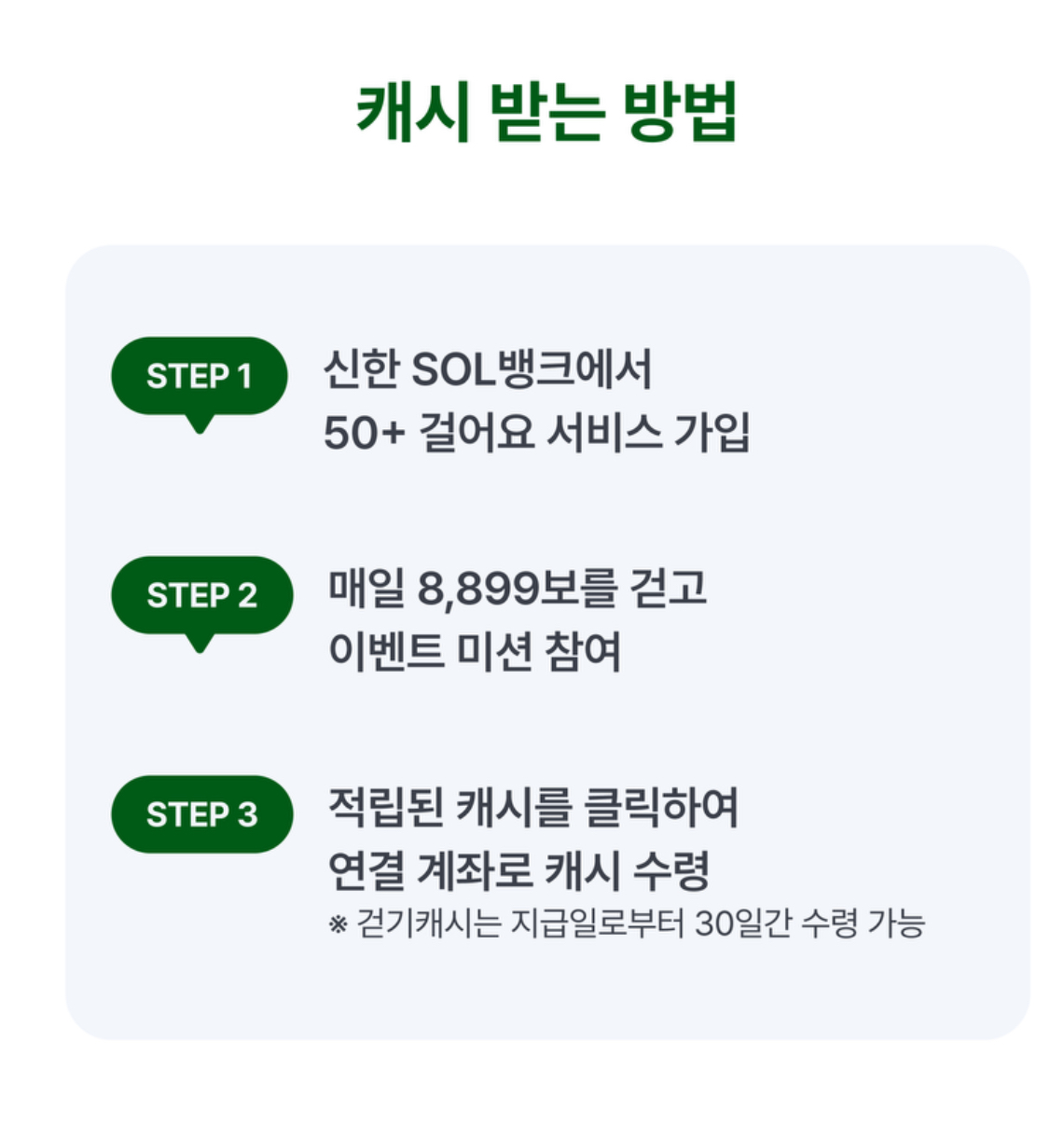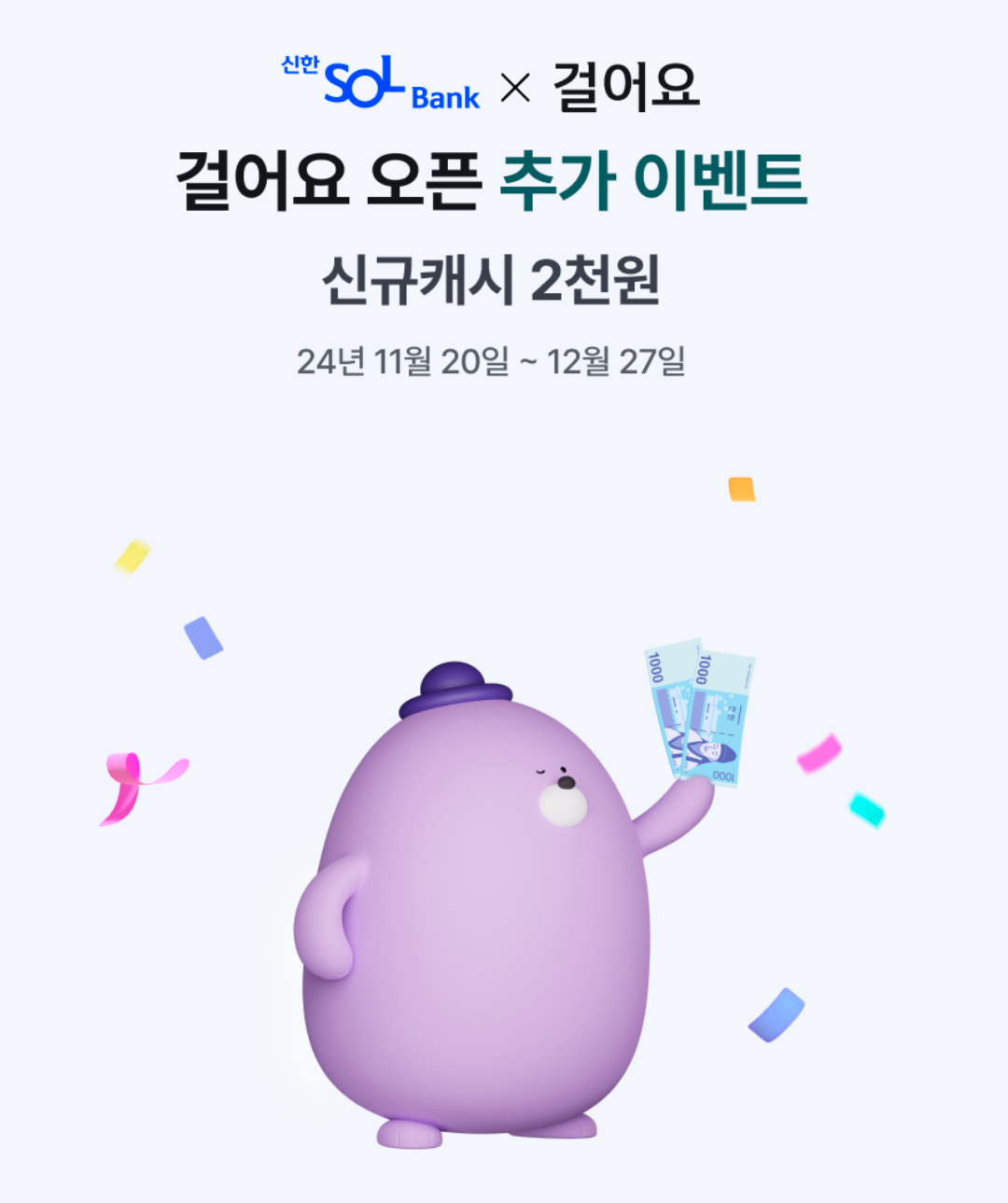 또한 24년 1월부터 10월까지 SOL뱅크 로그인 이력이 없는 고객이 50+ 걸어요 서비스 가입한 경우 2천 원 추가 증정됩니다.