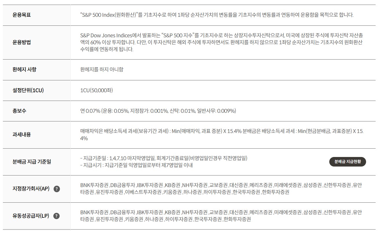 - 구성종목 : 미국 주식시장에 상장되어 거래되는 종목으로 시가총액 상위 500종목