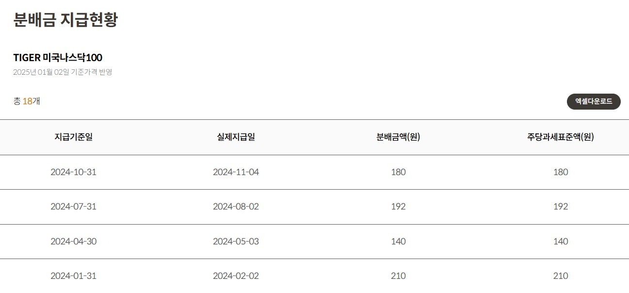 타이거 미국 나스닥 ETF 분배금은 분기마다 지급하면서 1년에 4번 받을 수 있습니다.
