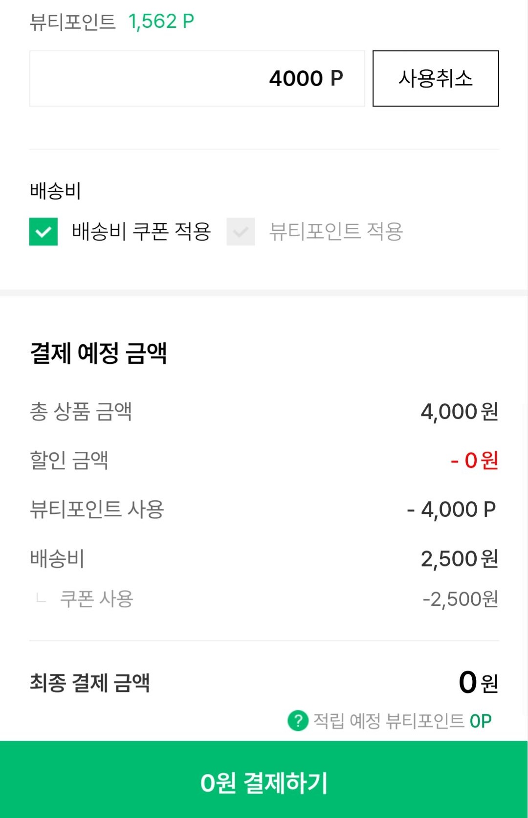 뷰티포인트 받은 2,500원이랑 남아 있었던 포인트 그리고 오늘 받은 무료배송 2,500원 쿠폰 사용해서 0원에 택배배송 신청 완료!!
