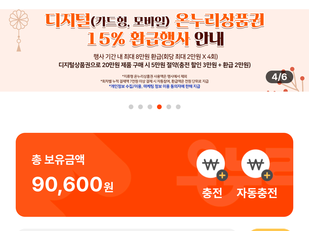 먼저 온누리상품권 앱 로그인 후 일정 금액 충전해 주세요.