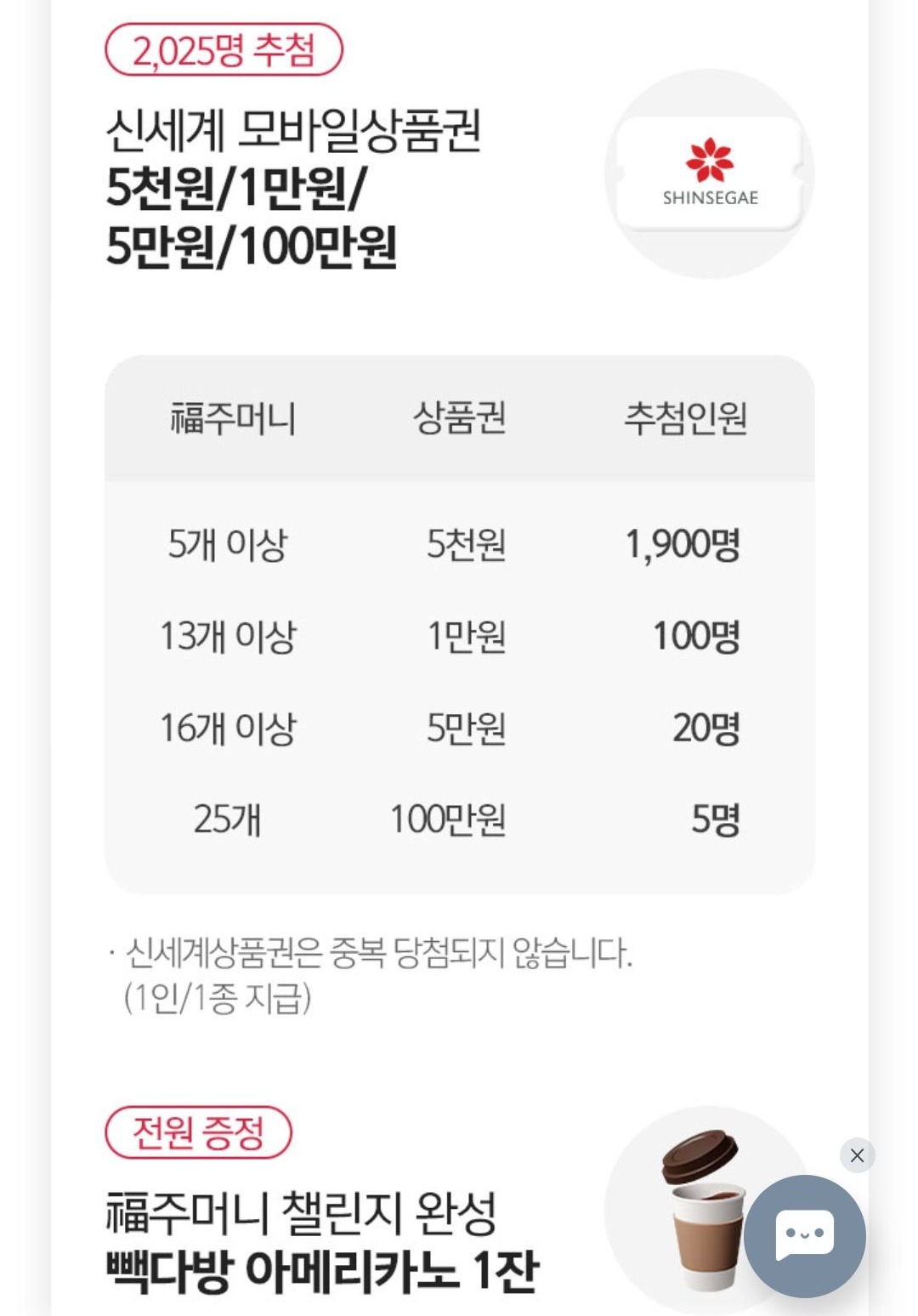 복주머니 모아서 2,025명 추첨으로 신세계 모바일상품권 5천 원 / 1만 원 / 5만 원 / 100만 원 받을 수 있습니다.