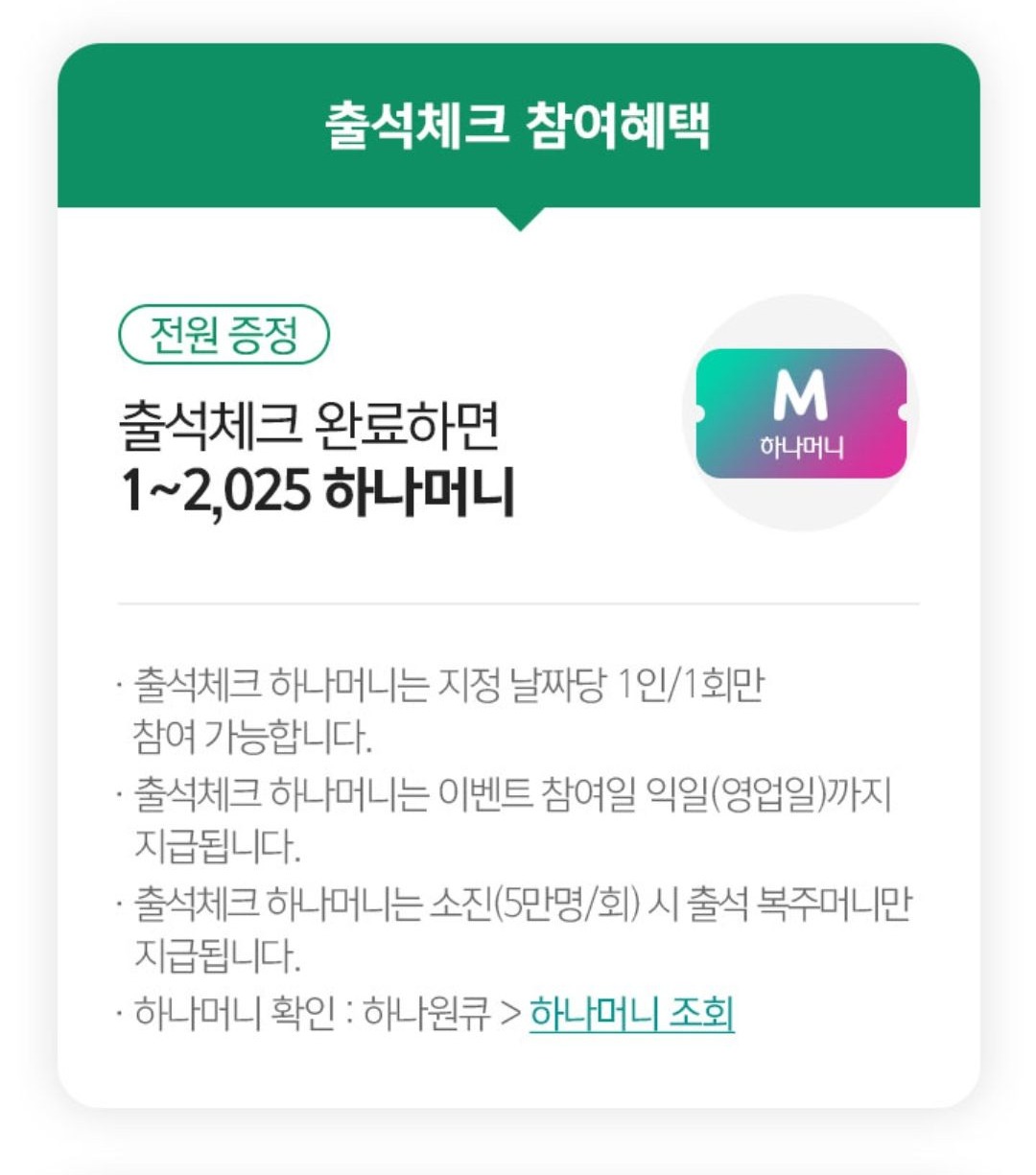 출석체크 완료하면 1~2,025 하나머니 랜덤 지급합니다. 지정 날짜당 1인, 1회만 가능해요. 0시 될 때 딱 하는 게 좋겠어요. 하루 5만 명 소진하면 복주머니만 준다고 합니다.