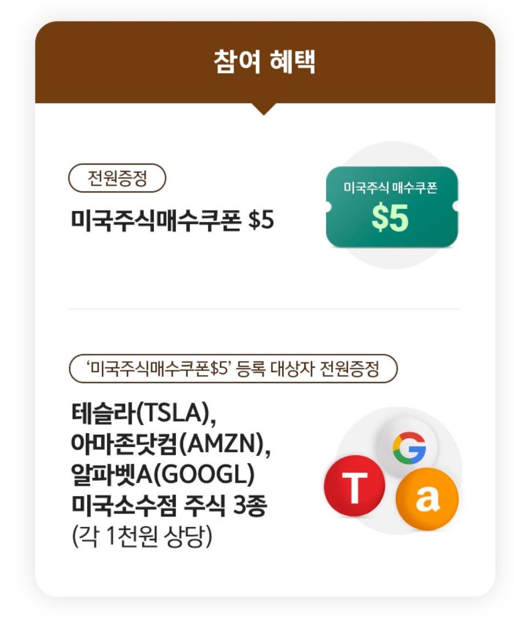 또한 미국 소수점 주식 3종목 각 1천 원 상당은 $5 등록하면 10영업일 이내 하나증권 종합매매계좌로 자동 입고됩니다.