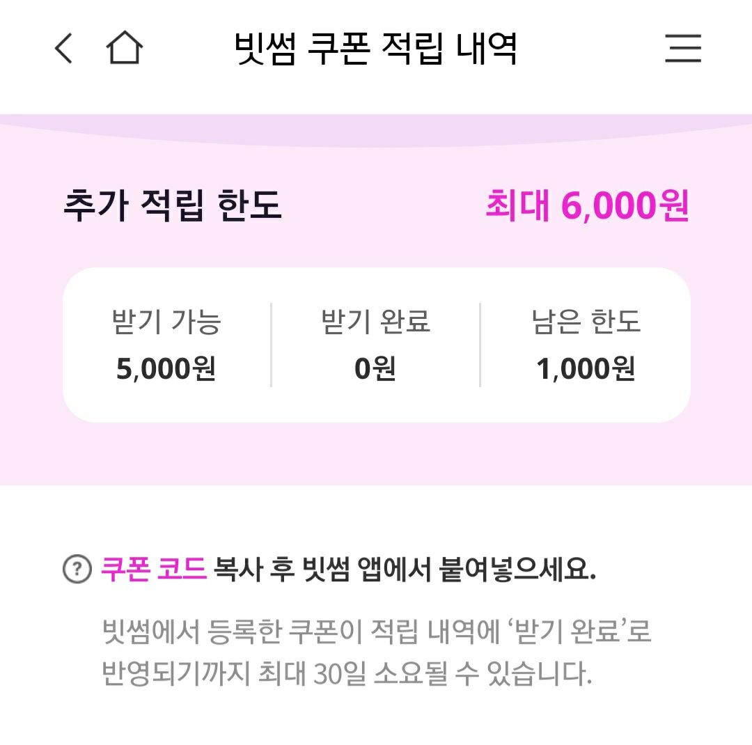 6,000원까지인데 저는 아직 1번 더 남았습니다. 앱테크로 1천 점 모아서 마스크팩 구매할 때 사용하고 쿠폰 받으려고요.