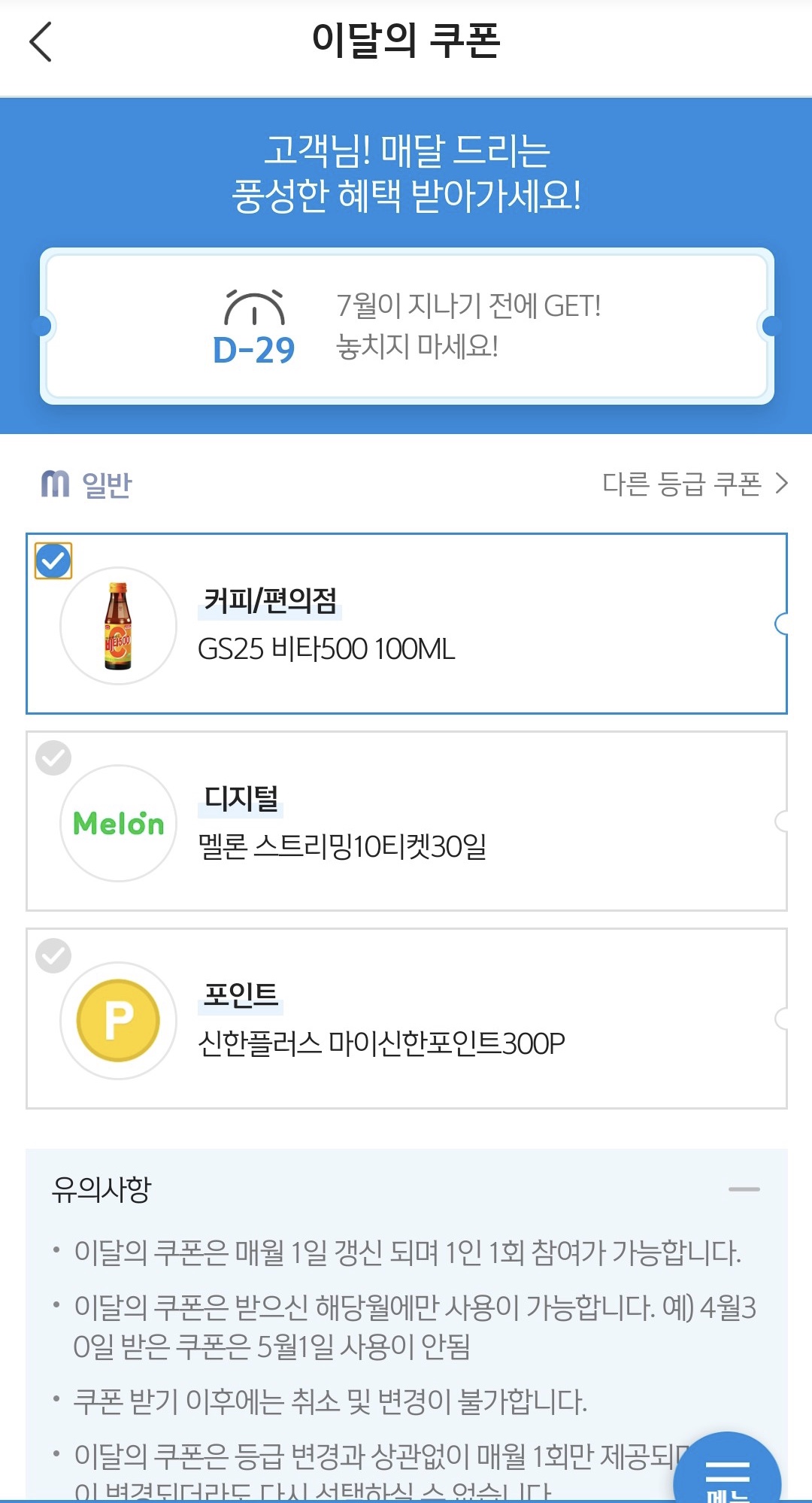 신한플러스 이달의 쿠폰은 등급마다 고를 수 있는 기프티콘, 쿠폰이 다릅니다.